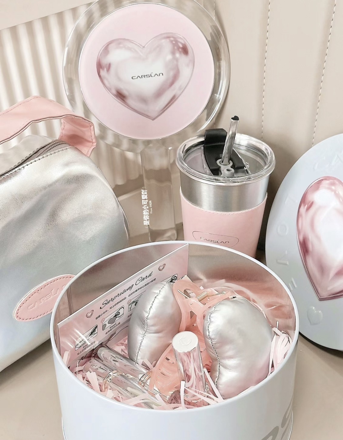 另外附愛心髮夾、手持鏡、手提收納包、愛戀銀河禮盒、表白刮刮卡。